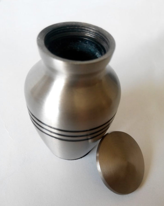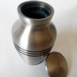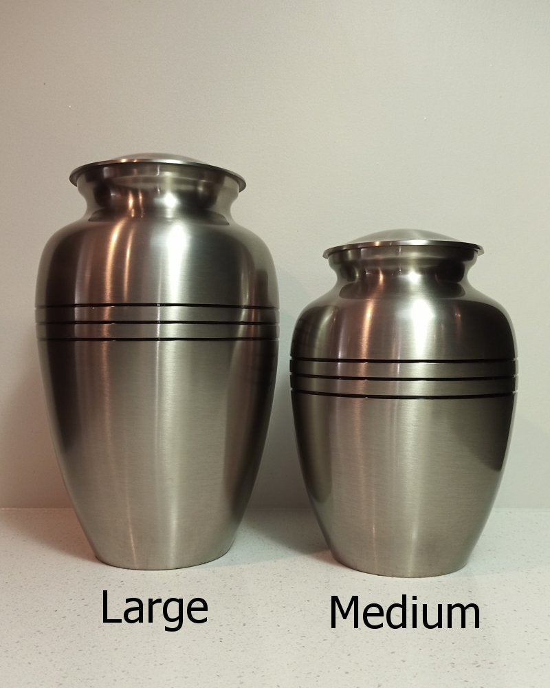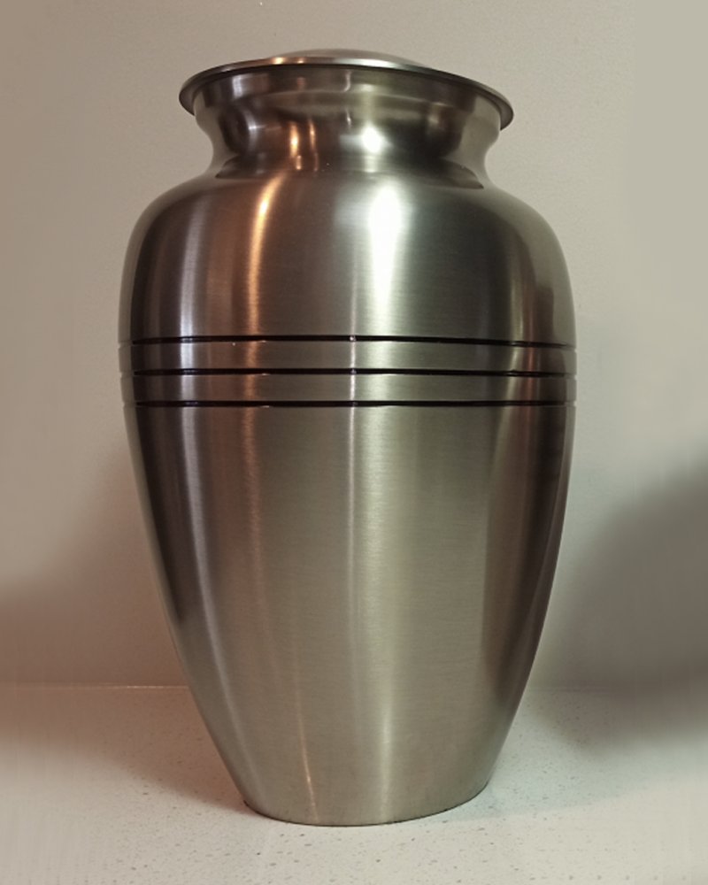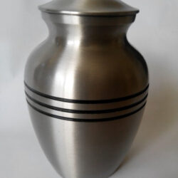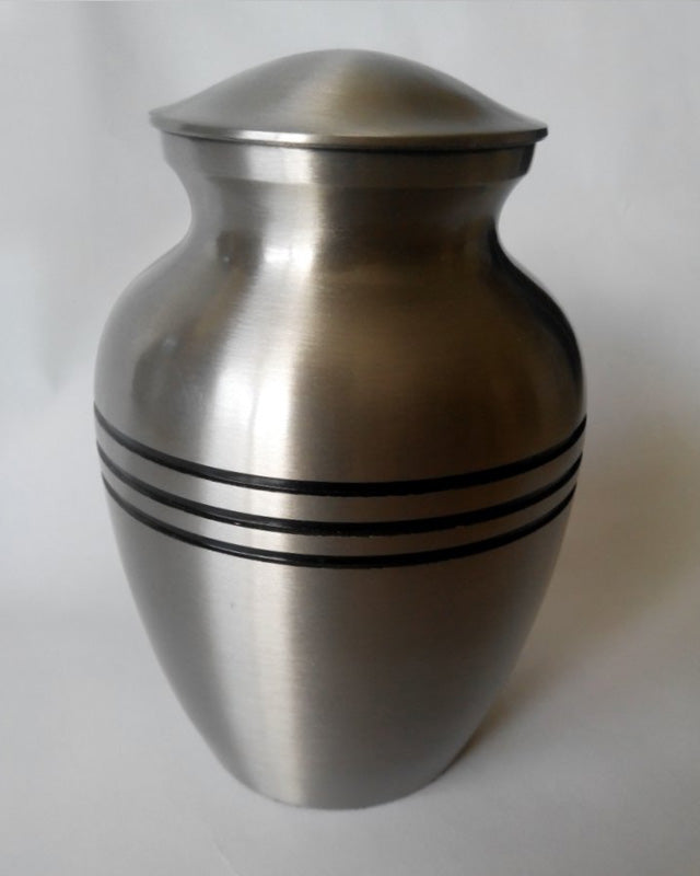 A standard size urn simply decorated with 3 black rings.