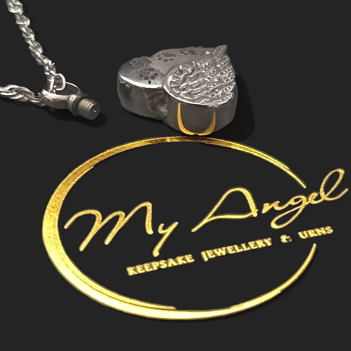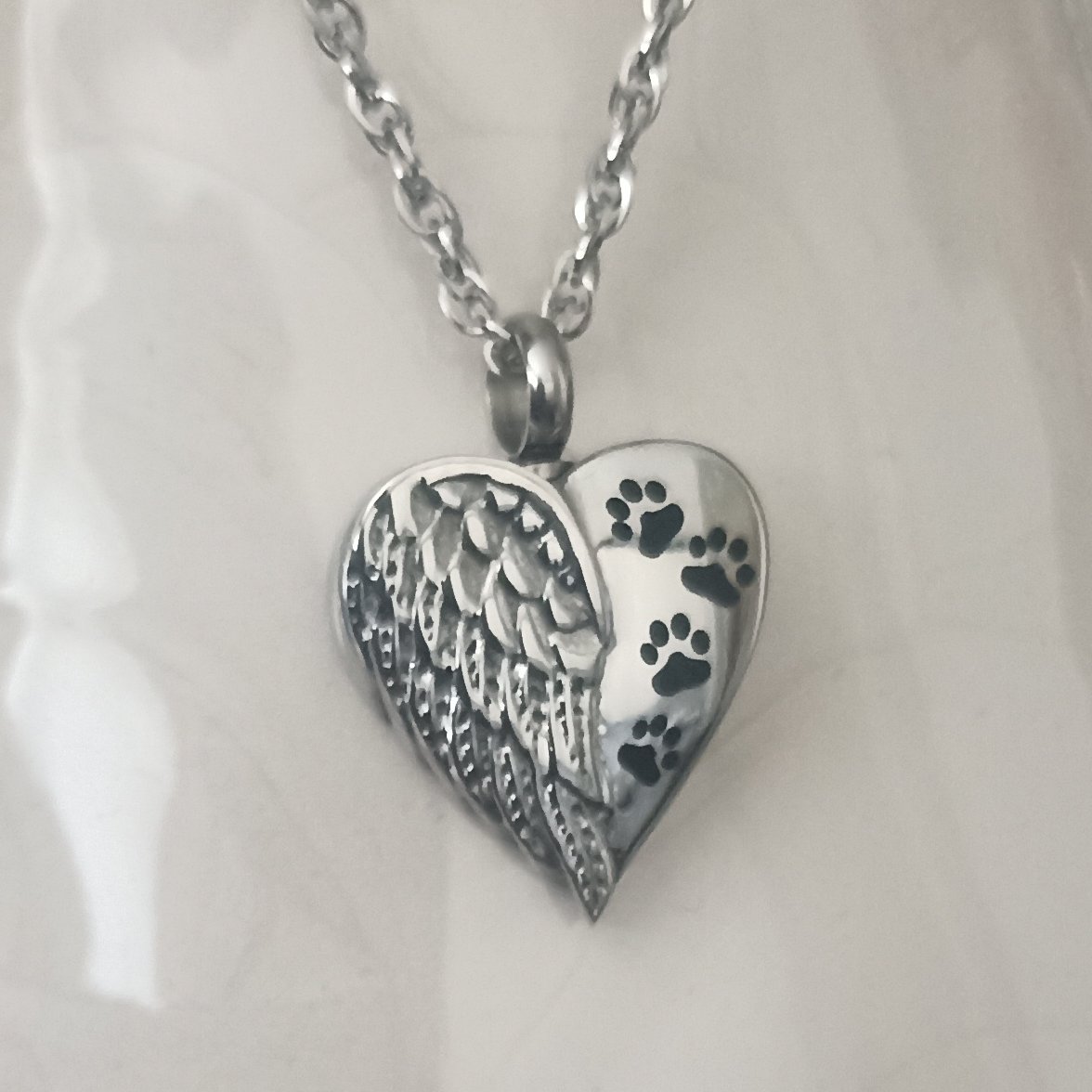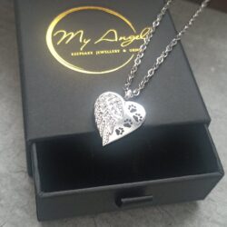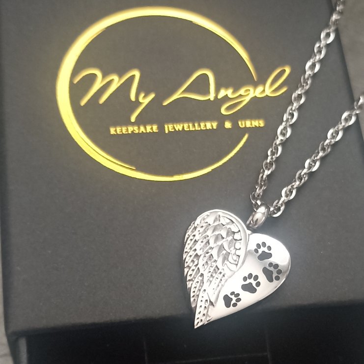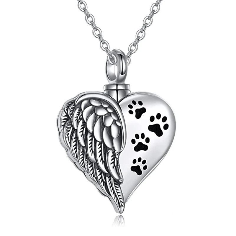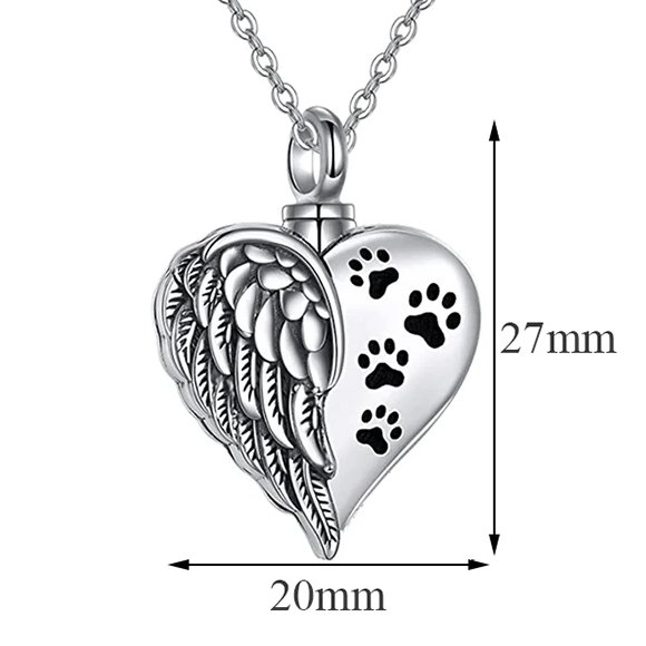 A lovely silver-toned, heart-shaped memorial necklace features an angel wing design alongside paw prints. A great way to hold a small amount of pet ashes and keep your precious pet close.
