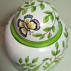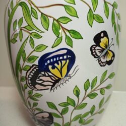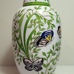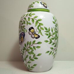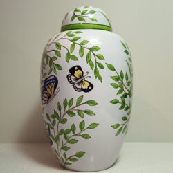 A crisp white urn adorned with hand-painted greenery and three butterflies in beautiful blue, pink, purple and yellow.
