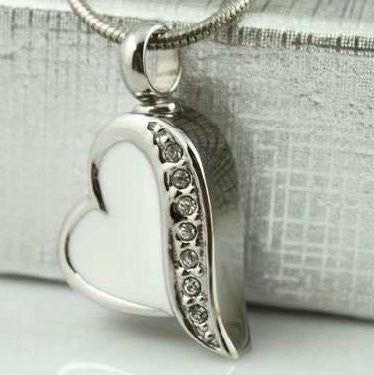 A beautiful styled silver heart with cascading diamantés on the edge. The white enamel inlay and polished accents make this pendant a statement for all occasions.