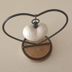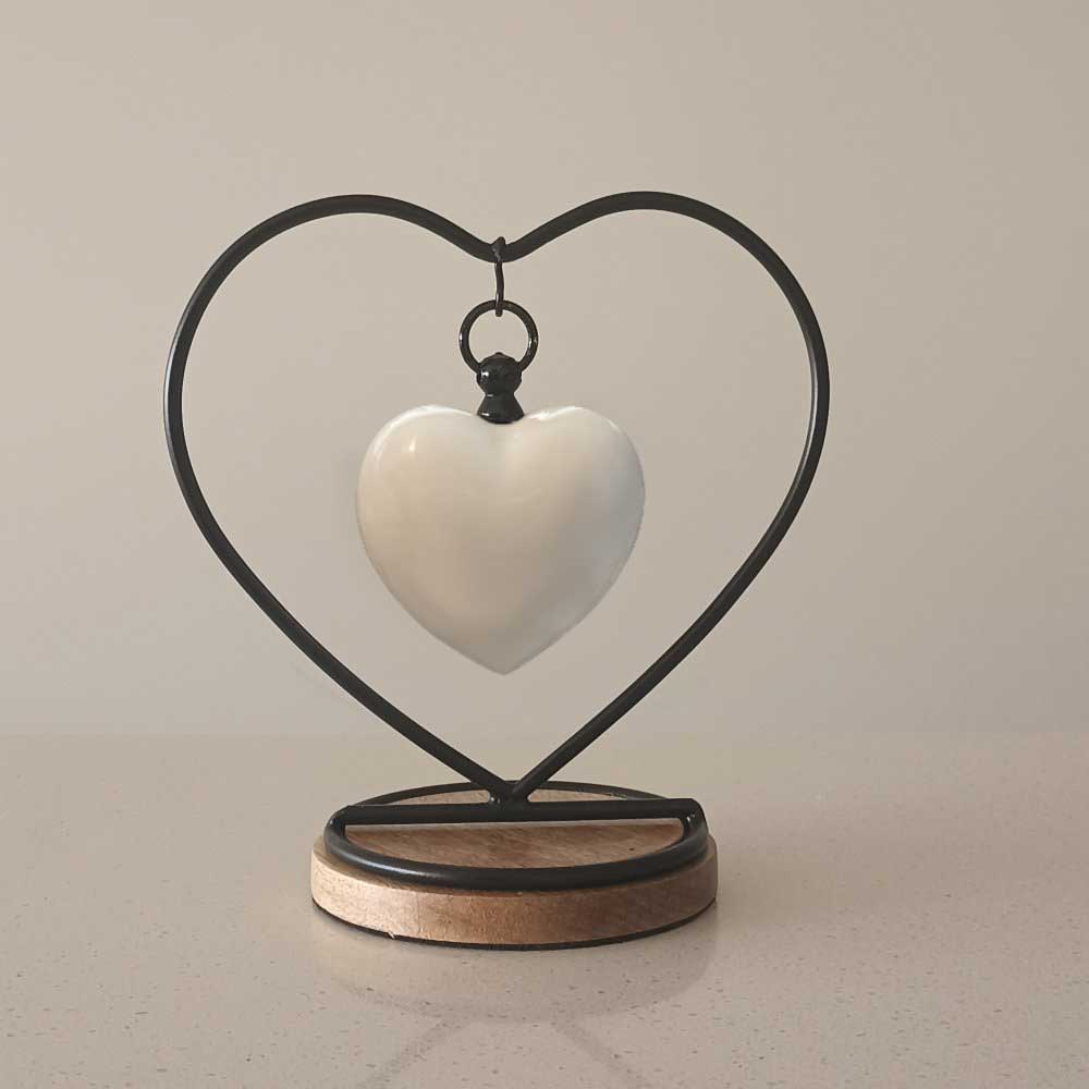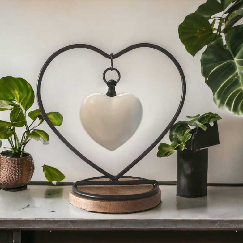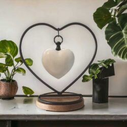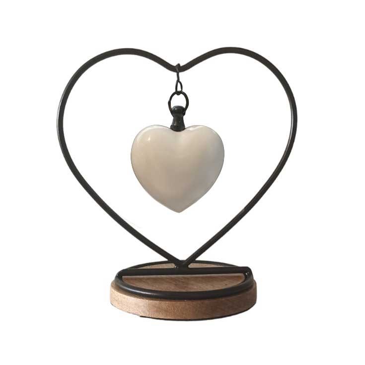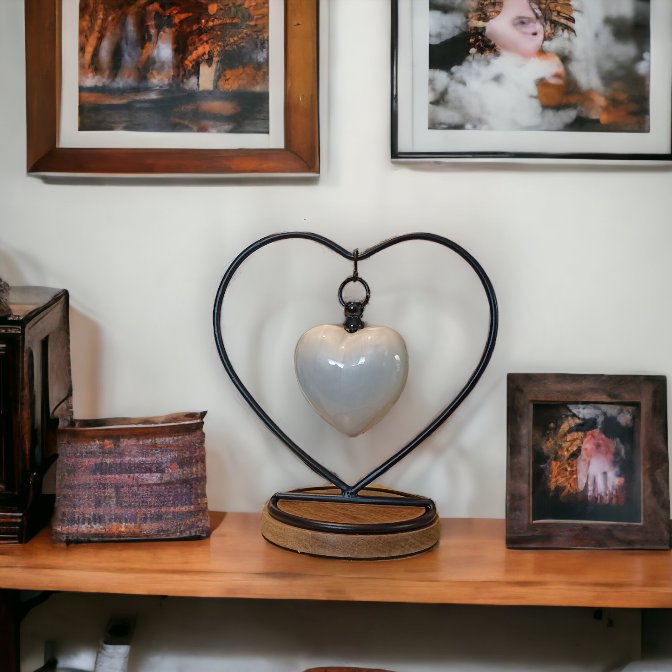 A totally unique heart urn! This hanging heart keepsake urn features a 75mm heart hanging from a wrought iron heart shape hanger on a wooden base.