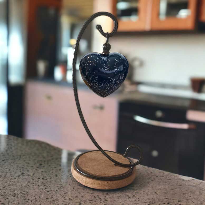 A totally unique heart urn! This hanging heart keepsake urn features a 75mm heart hanging from a wrought iron stand on a wooden base.