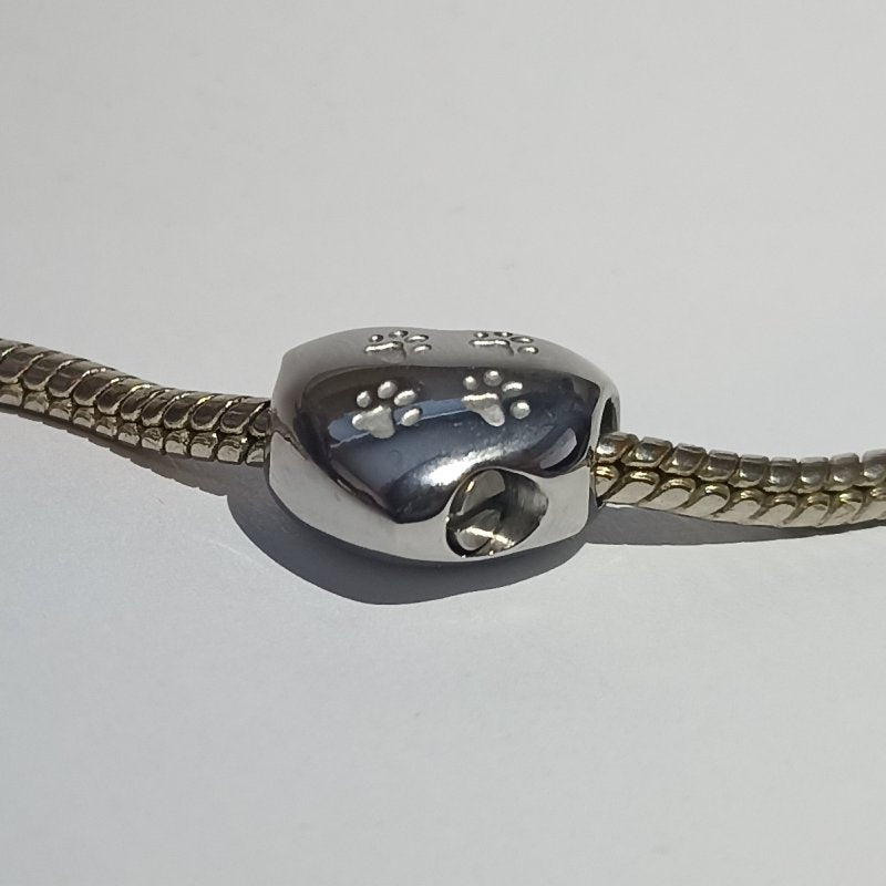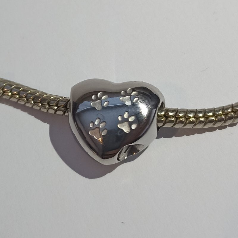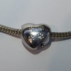 A small rounded silver heart with 4 paw prints engraved on the front. This charm holds some ashes of your pet, ready to fit on your European Style Bracelet (Pandora Compatible). Please note this is the charm only to add to your own bracelet.