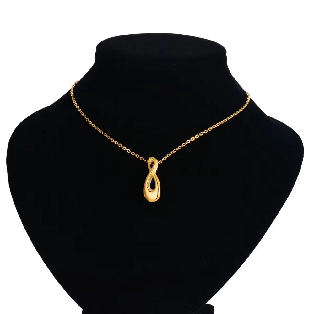 A large gold infinity pendant in a lovely polished finish. The chain loops through the top of the inifinity symbol.