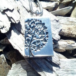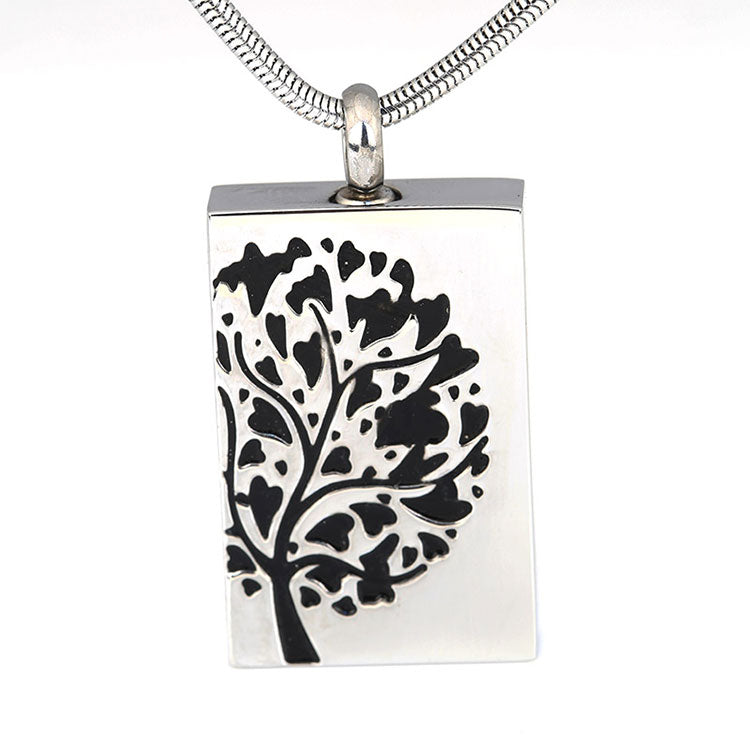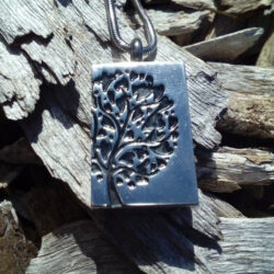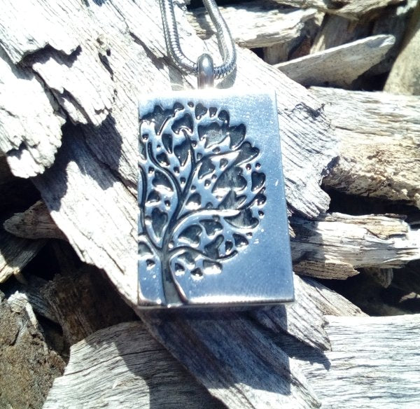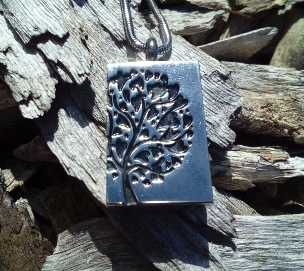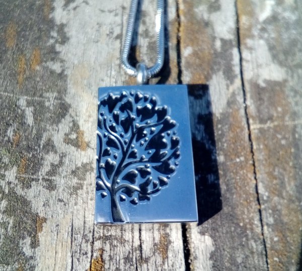 A beautiful strong, solid rectangle pendant with a tree engraved featured on it. The leaves of the tree are actually little hearts. A high polish finish makes this pendant a statement piece.