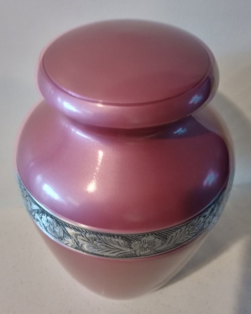 A lovely unique pink with a semi gloss finish and beautiful silver floral band.