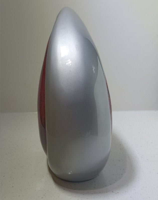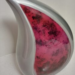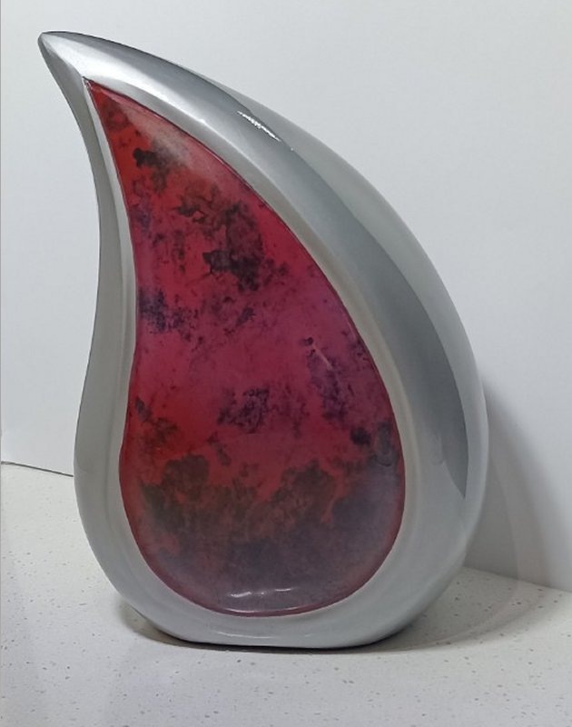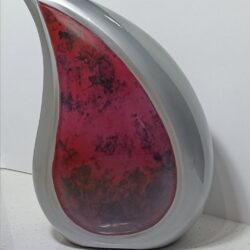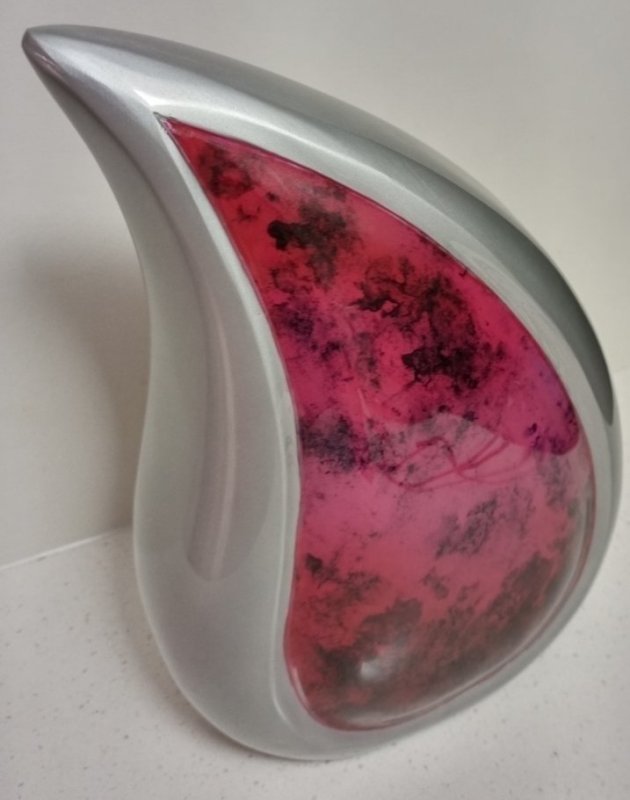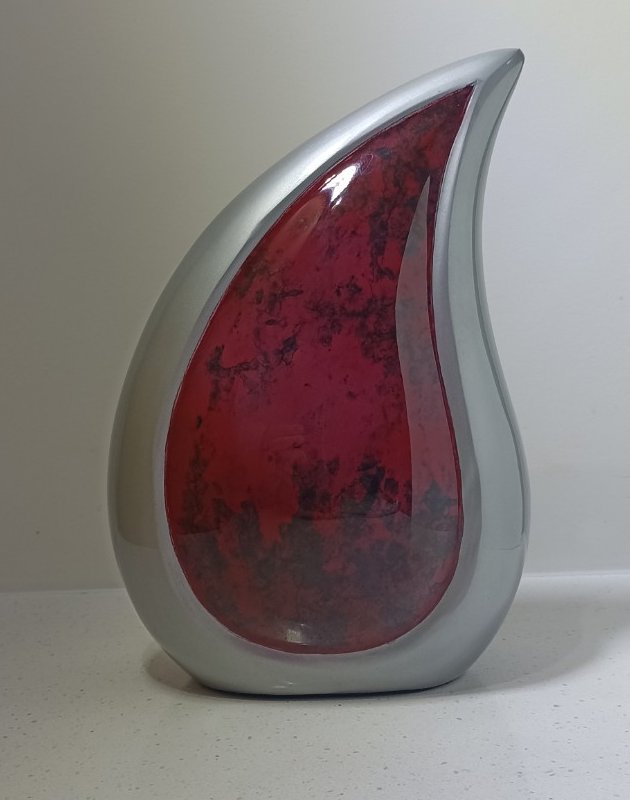 A simply stunning & unique shaped urn with glossy marble rich reds in the centre and a pewter finish. The symbol of the teardrop is so moving and appropriate at this sad moment.