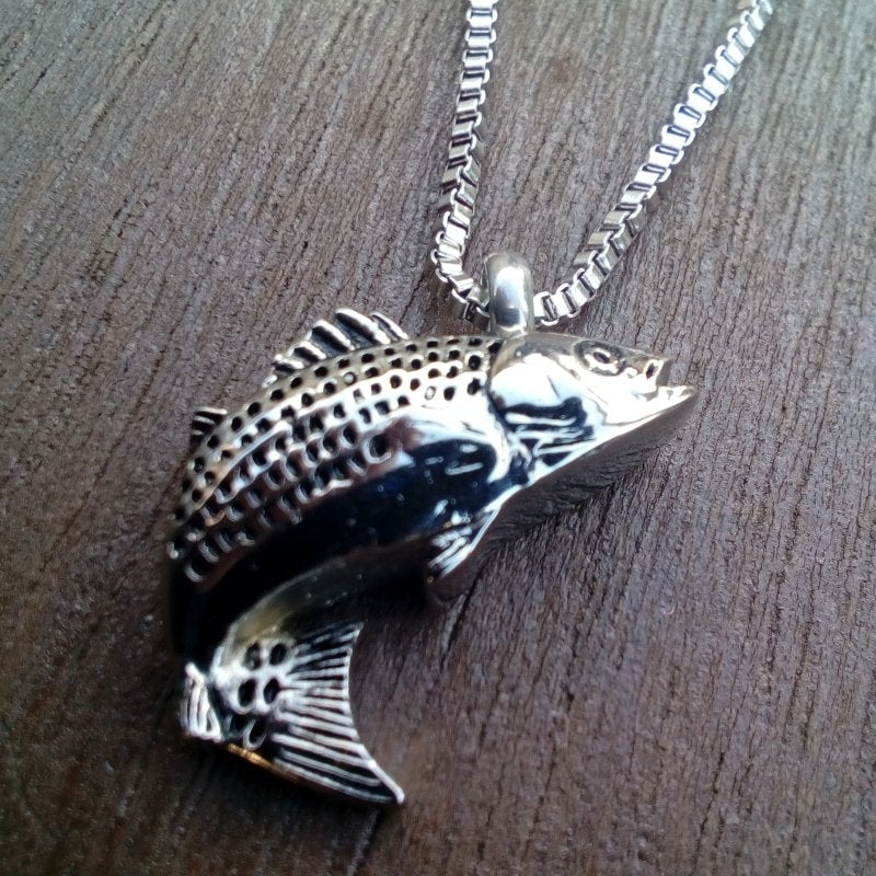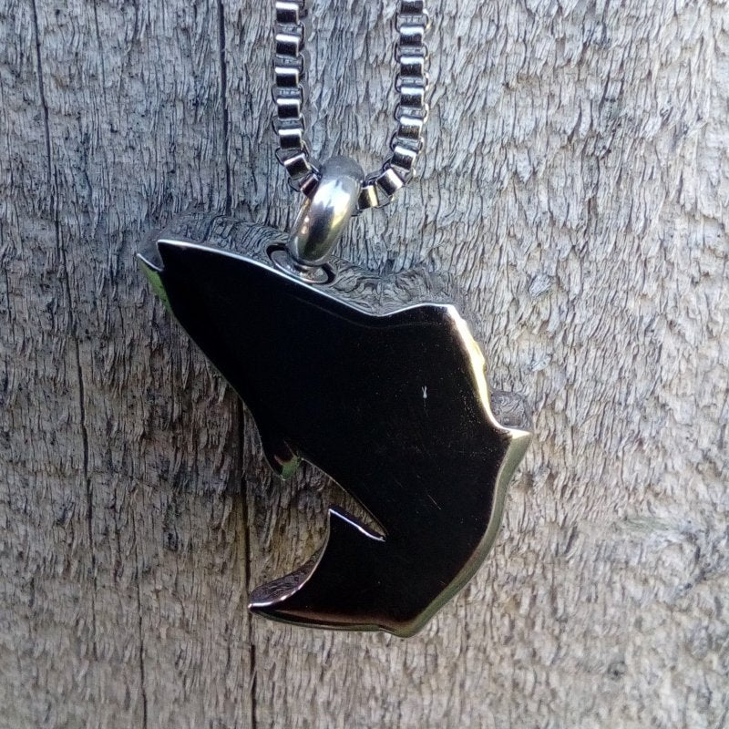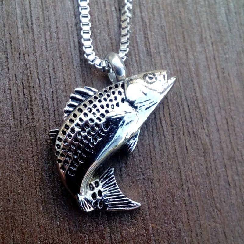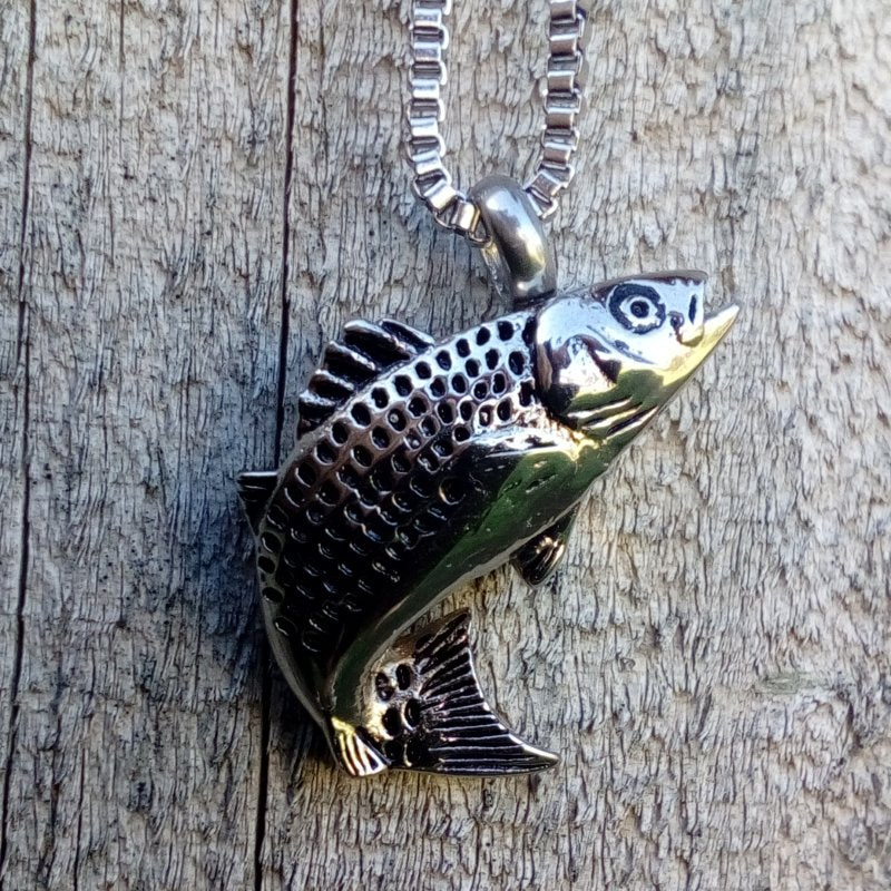 This pendant is finished in polished silver with black highlights for scales. A stunning tribute to your fisherperson , which will keep your secret inside.