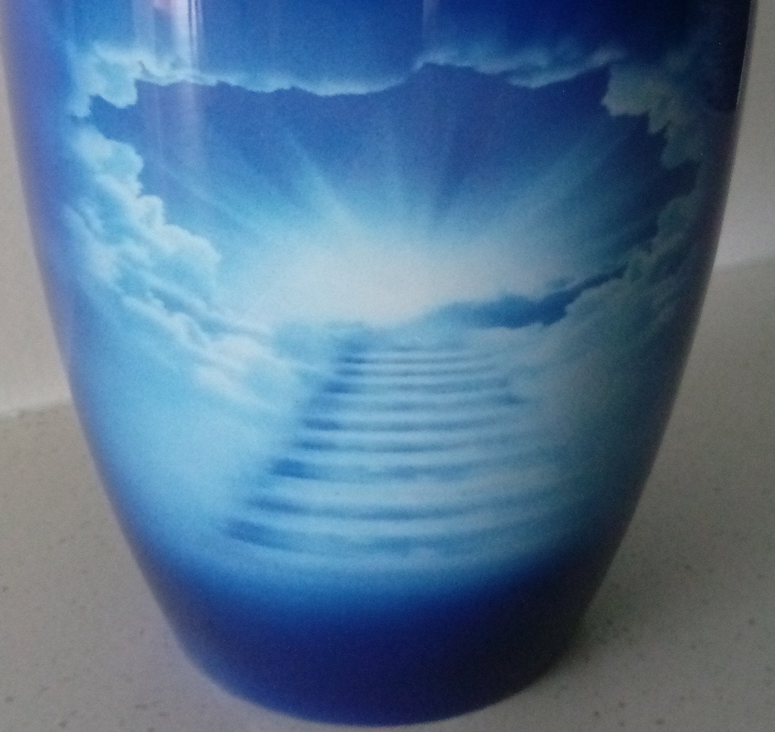 A stunning blue urn with a gloss finish with an awesome image of stairs going through the clouds into a light. The back of the urn is plain, dark blue. It is a magical, symbolic urn.