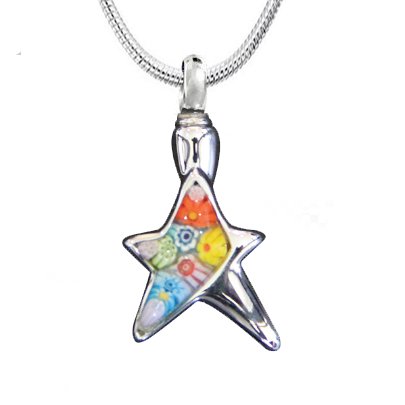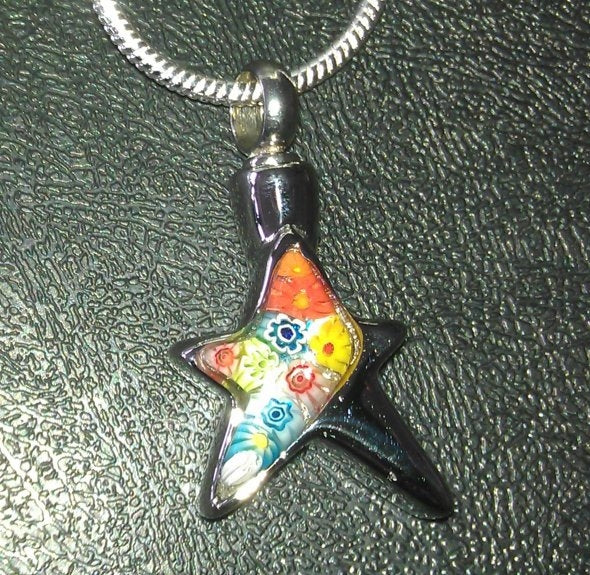 A modern star shaped pendant with a colourful floral insert. Unique and special to hold the memorial of your loved one. Each pendant is slightly different due to the glass insert providing a unique pattern. The memorial is not visible behind the glass insert.